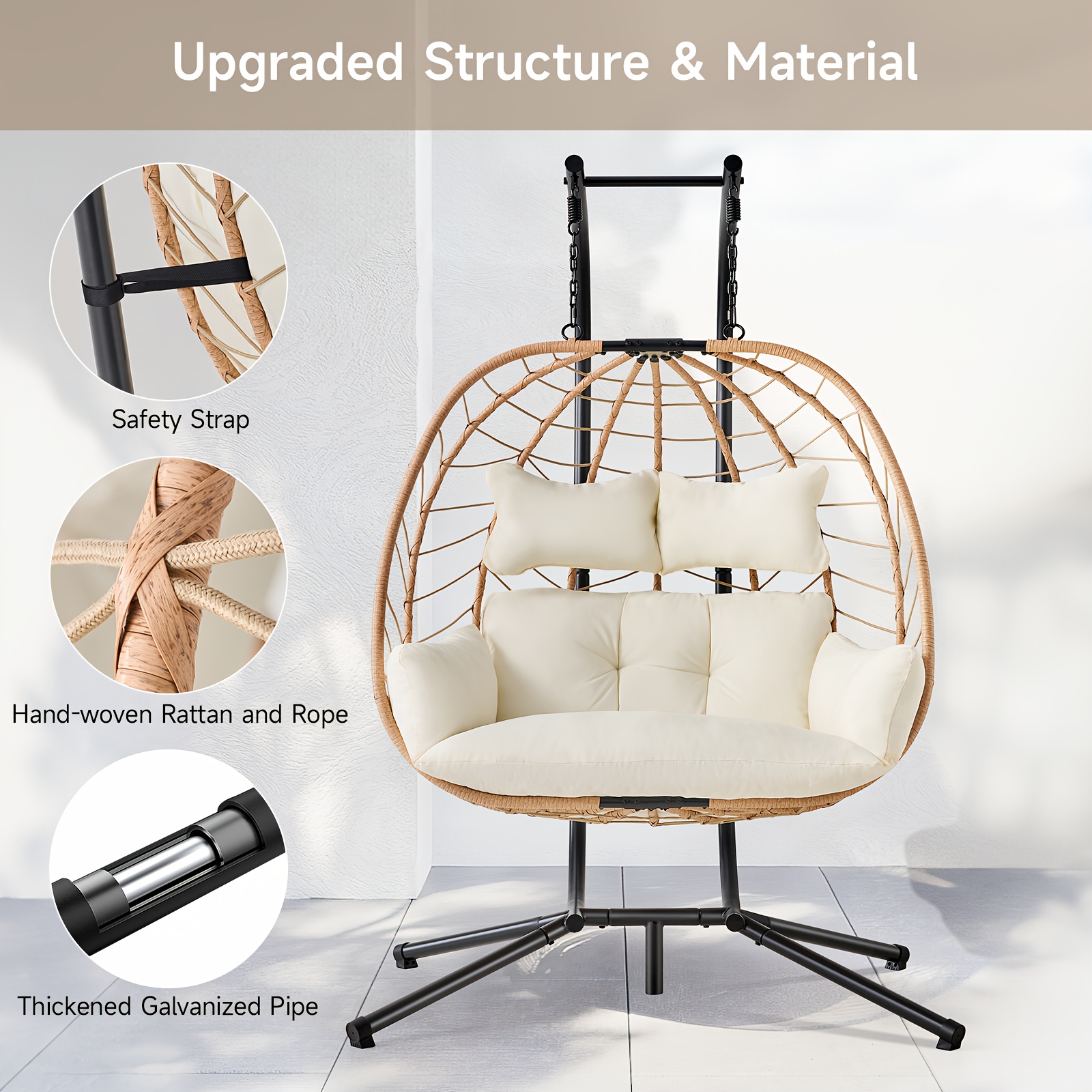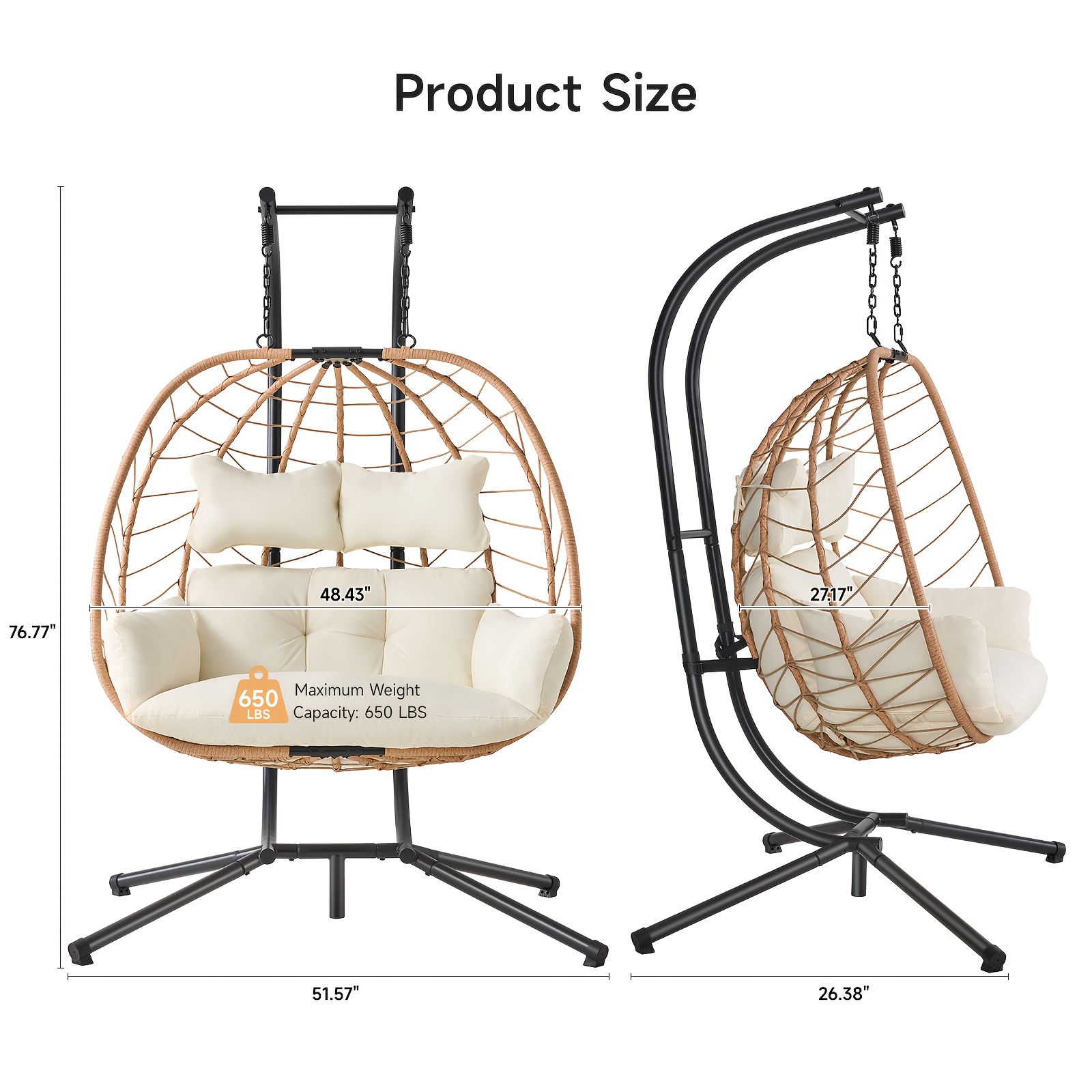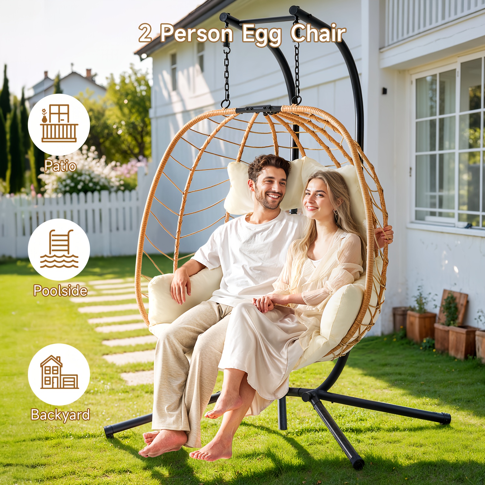 48.4 Inch Double Egg Chair With Stand, Outdoor Double Hammock Swing Chair With Cushions And Headrest, 650 Pounds Weight Capacity, Suitable For Patio, Garden, Poolside (Yellow Beige)