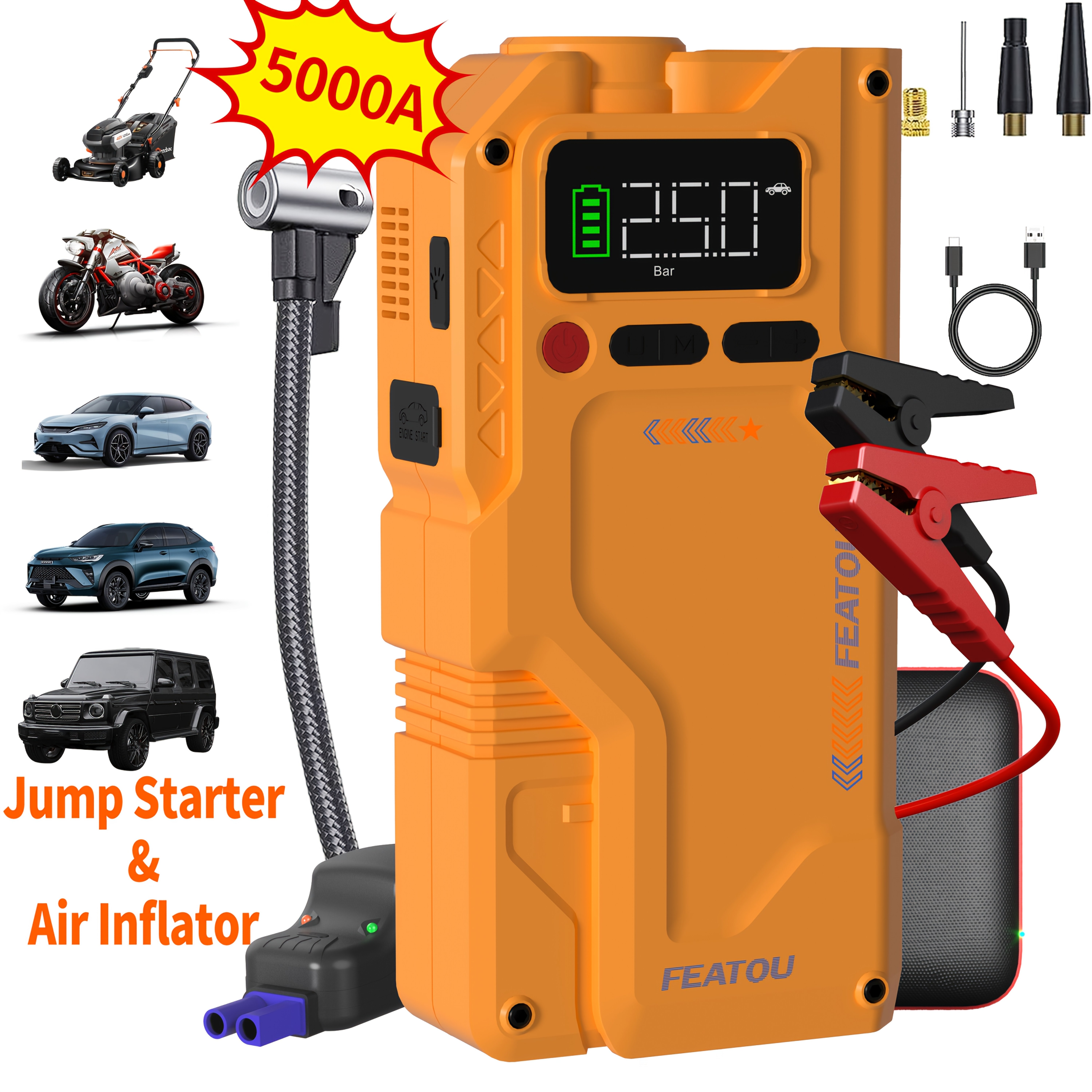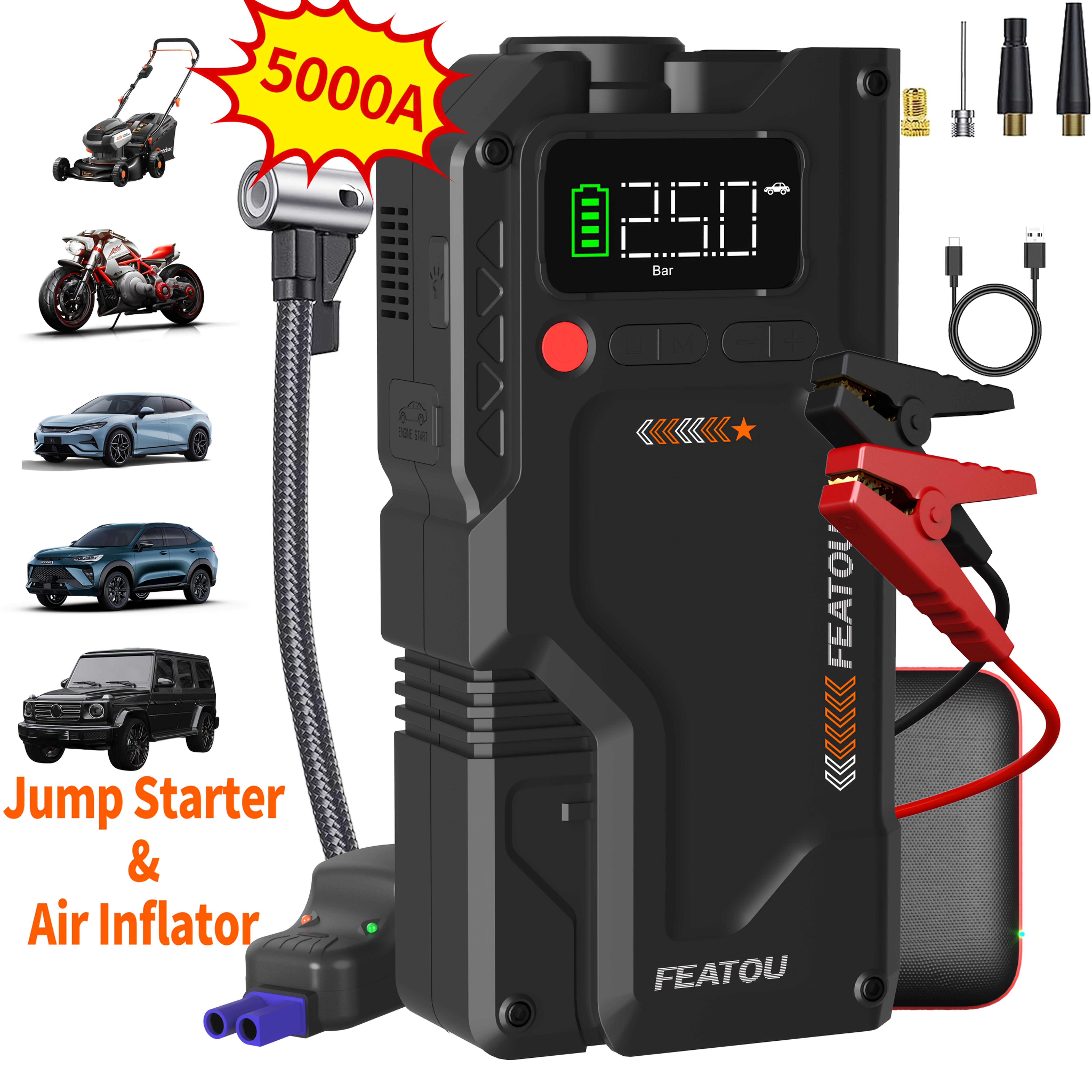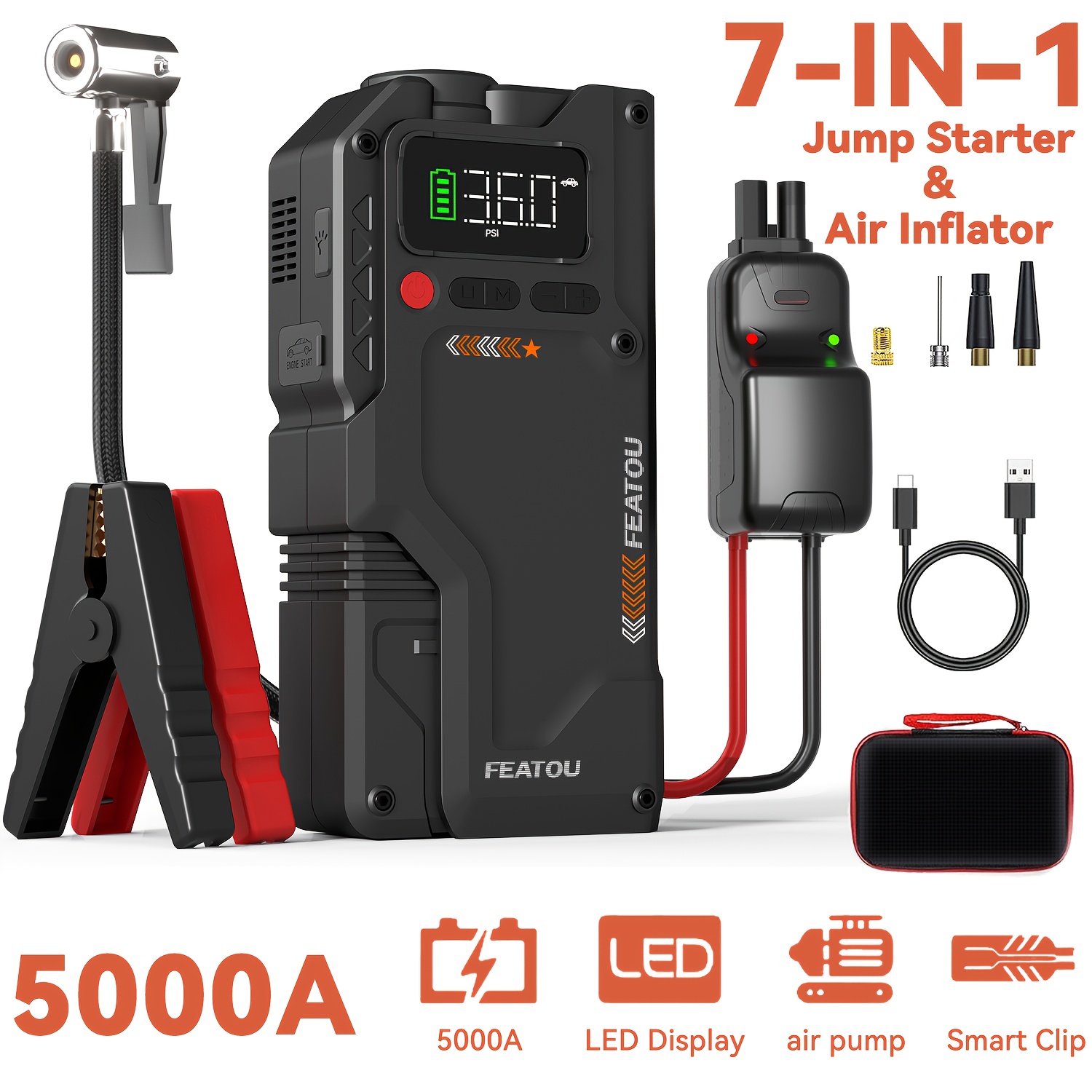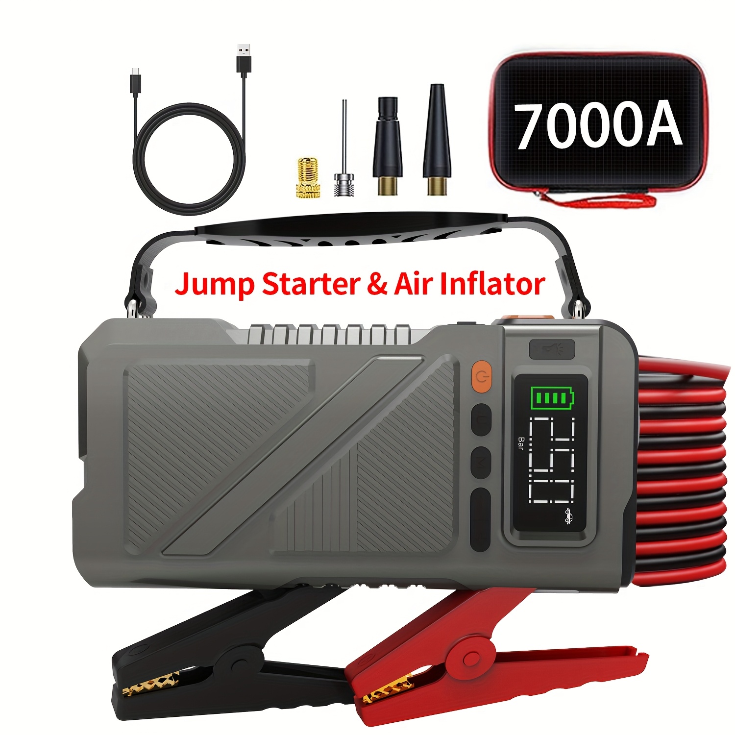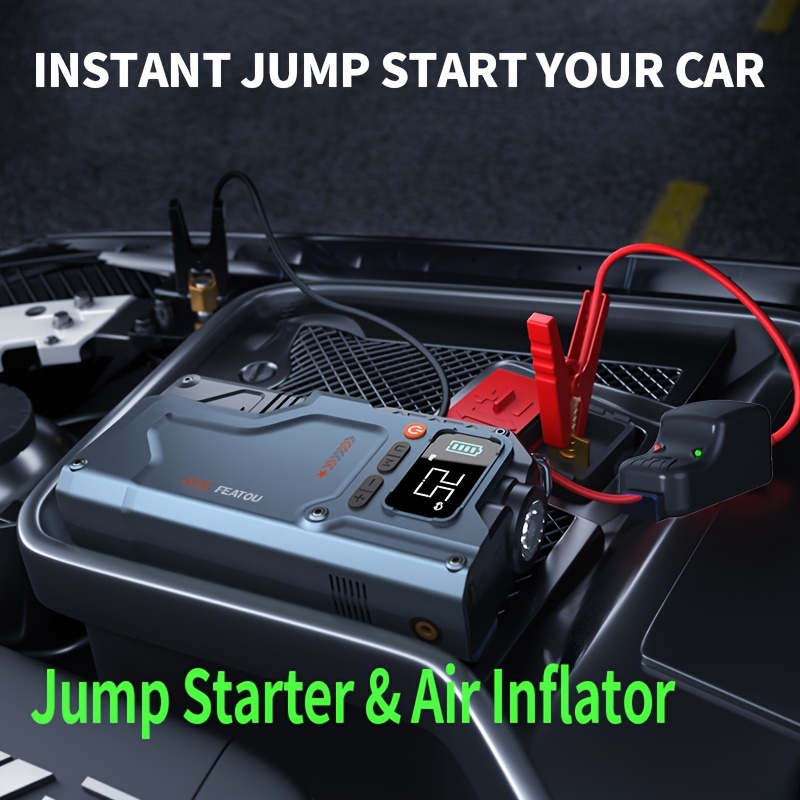 7000A Jump Starter with Air Compressor, Portable Car Jump Starter, 5000A&7000APeak Jump Starter Battery Pack With150PSI Digital Tire Inflator, Car Battery Charger Portable for 10.L Gas Or 2.38gal Diesel Fast Charging USB Output, LED Emergency Lighting