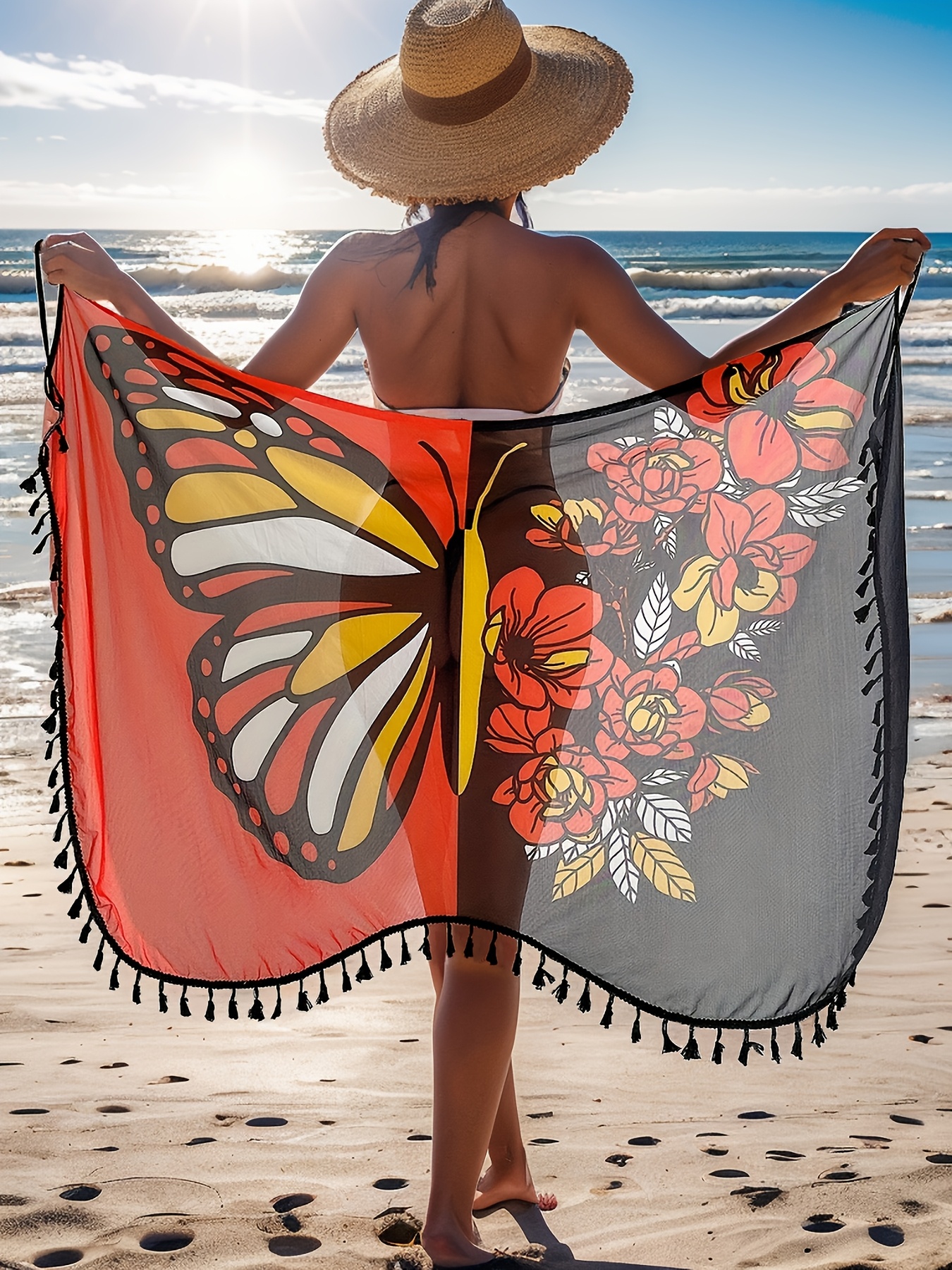 [Bohemian Beach Wrap Dress] Bohemian Beach Wrap Dress for Women | Color Block Butterfly & Floral Print, Fringe Detail, Sleeveless Cami Style | Summer Vacations, Beach Coverup