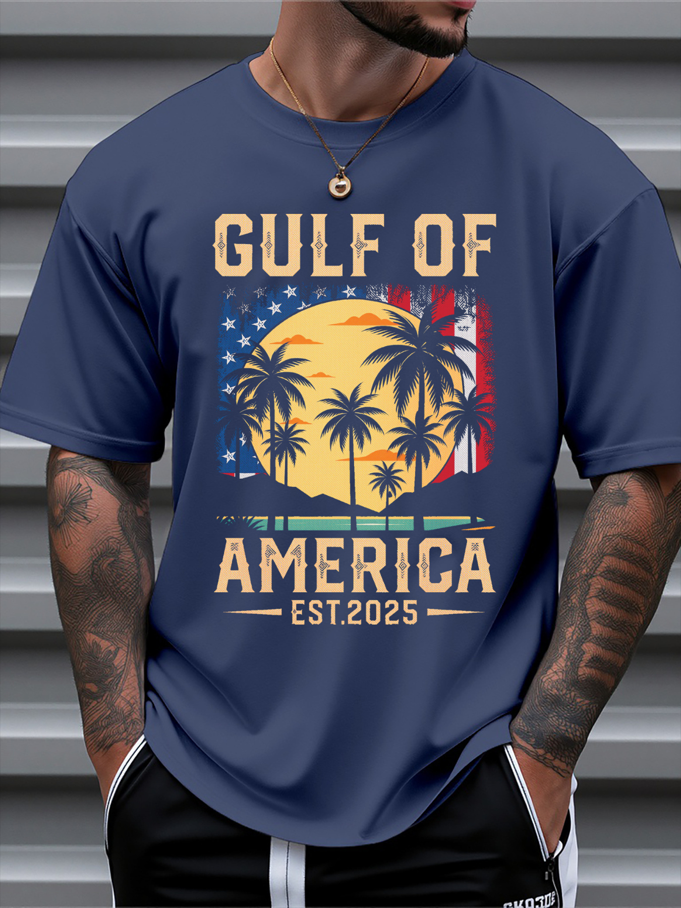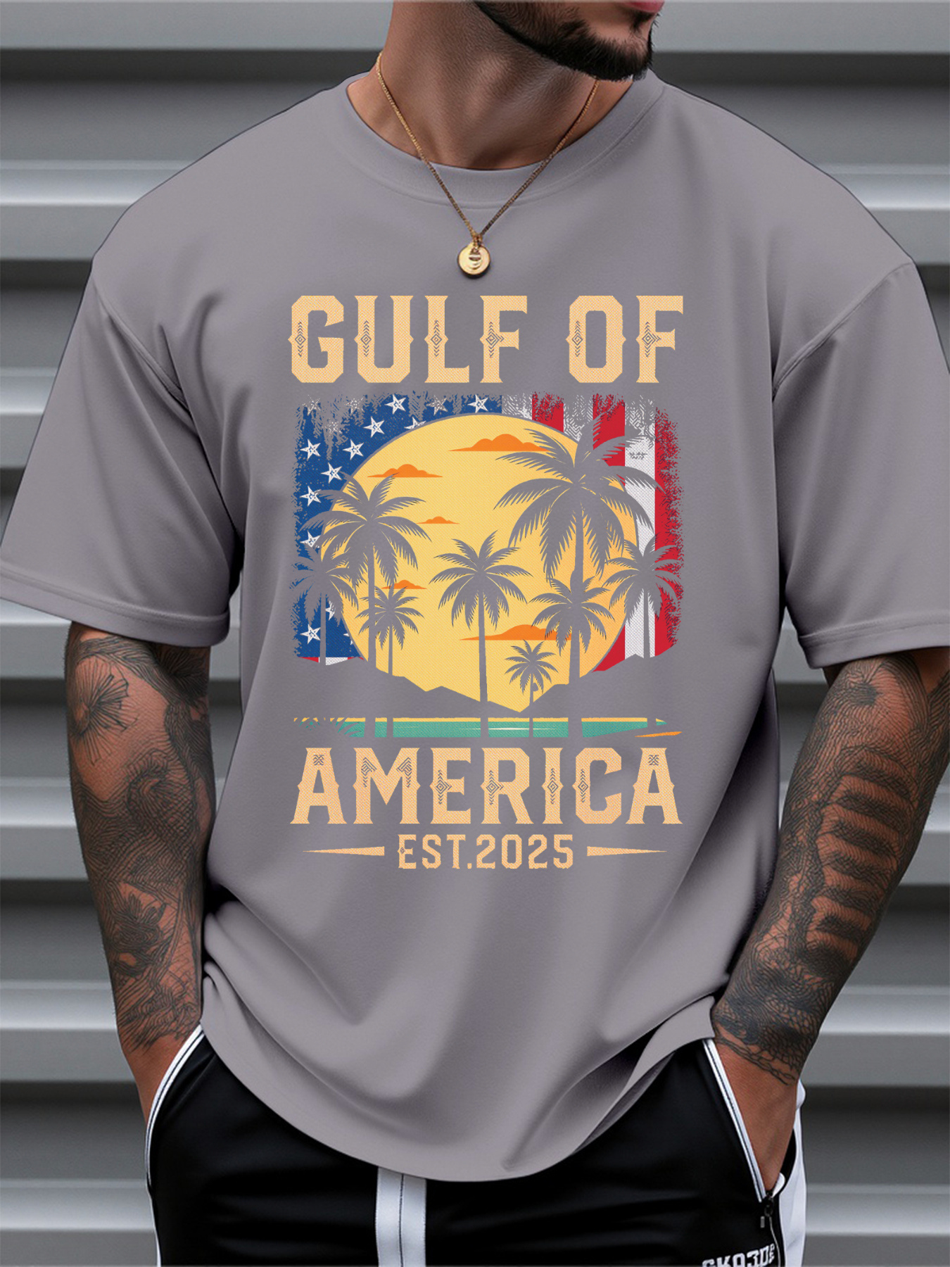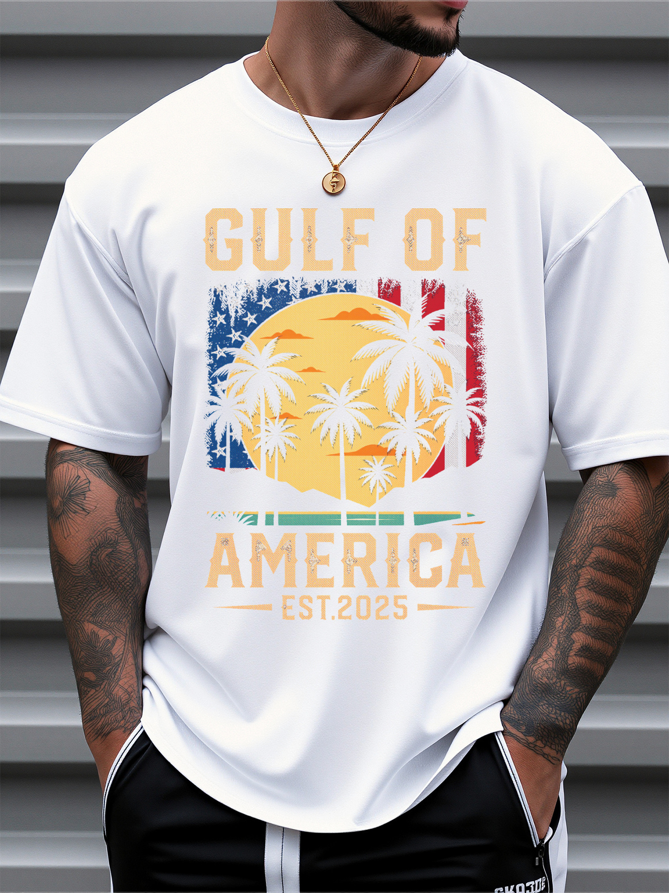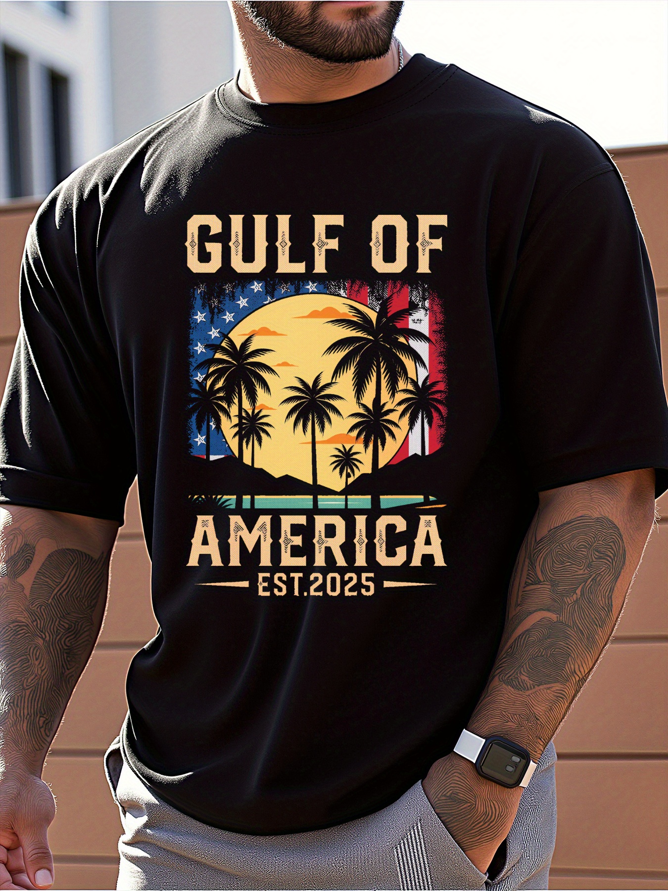 Men’S Patriotic Gulf of America T-Shirt – 100% Cotton Casual Short Sleeve Round Neck Tee with Palm Tree & Sunset Print, Comfortable Summer Beachwear for Travel, Vacation & Outdoor Activities, Beach T Shirt, Travel Clothing, American Flag Design, Durable Casualwear